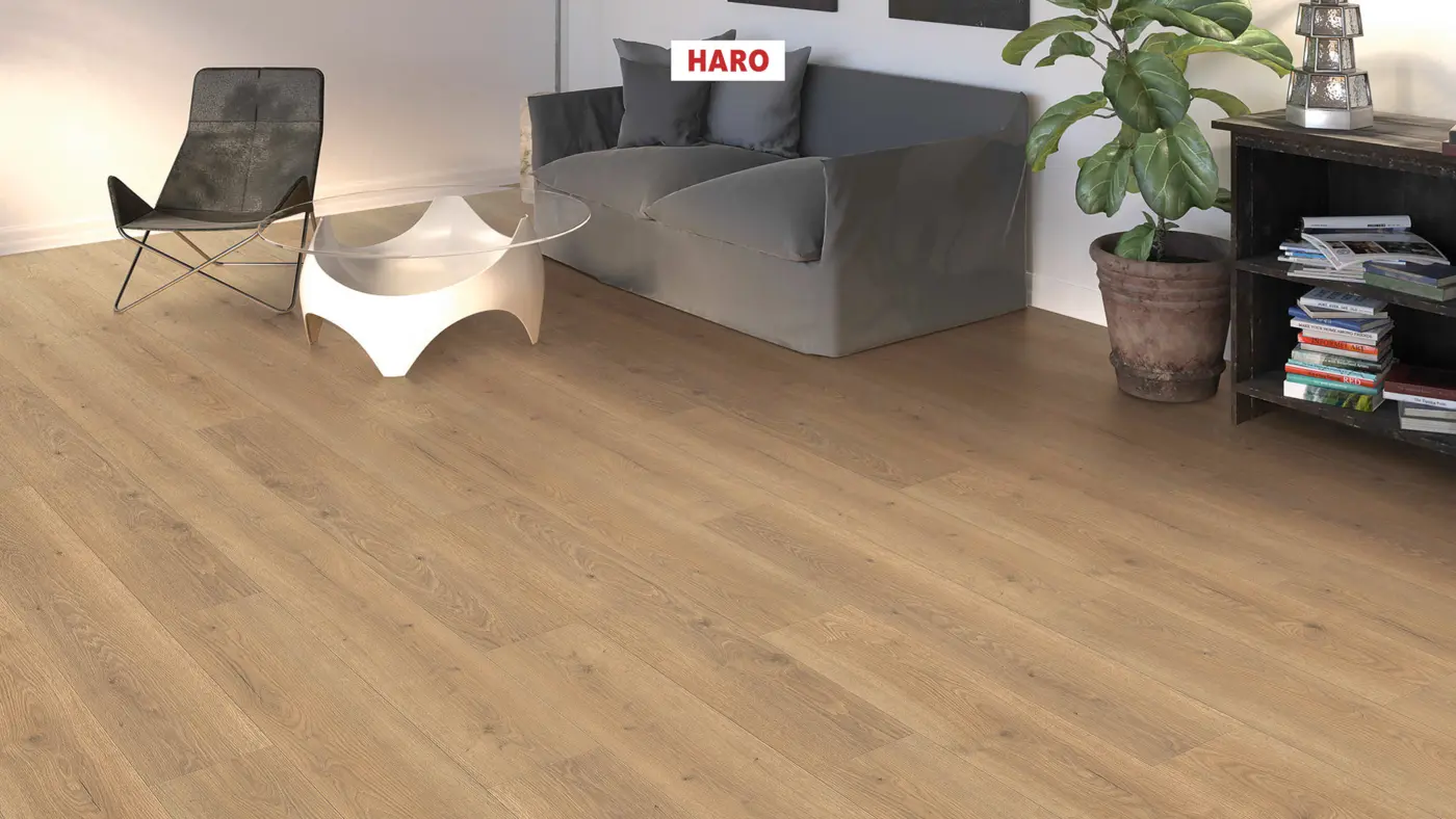 Der Laminatboden HARO Tritty 100 Landhausdiele 4V Silent CT Eiche Flavia natur verbindet natürliche Holzoptik mit modernen technischen Eigenschaften. Das warme Beige und die ruhige Maserung sorgen für eine zeitlose, einladende Atmosphäre in jedem Raum.