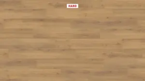 Der Laminatboden HARO Tritty 200 AQUA Landhausdiele 4V in der Ausführung Eiche Emilia Honig vereint ansprechende Holzoptik mit hoher Funktionalität. Die Oberfläche zeigt einen ruhigen, modernen Charakter in einem hellen Beigeton und vermittelt so ein einladendes Wohngefühl.