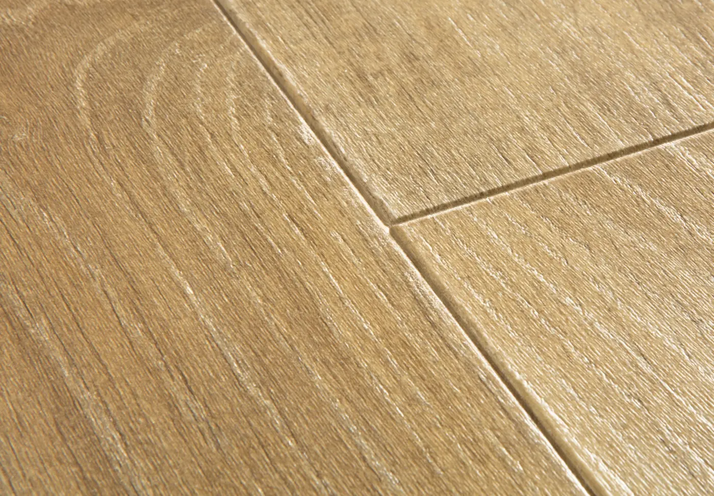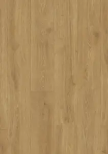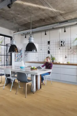Der Quick-Step Hydroseal Designboden Majestic Eiche Woodland Natur zum Klicken vereint die natürliche Optik einer Landhausdiele mit einem modernen Klicksystem. Die authentische Holzstruktur in einem ruhigen, mittleren Beigeton schafft ein behagliches und stilvolles Wohnambiente, ideal für anspruchsvolles Wohnen und Arbeiten.
