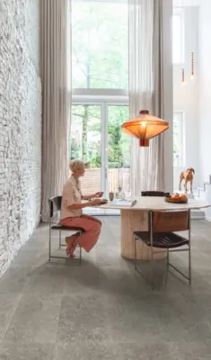Der Quick-Step Hydroseal Naturboden Muse Blaustein dunkel (MUS5485) vereint authentische Steinoptik mit den praktischen Vorteilen eines modernen Designbodens. Die Oberfläche präsentiert sich in eleganter Fliesenoptik mit ruhigem Erscheinungsbild und mittelgrauem Farbton. Durch das Uniclic-Klicksystem gestaltet sich die Verlegung besonders einfach und zeitsparend.