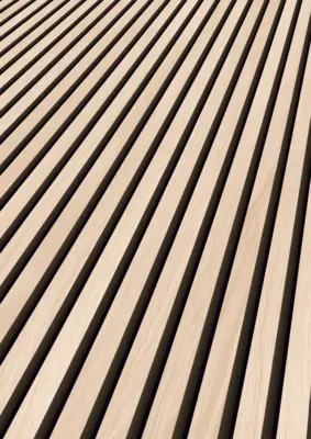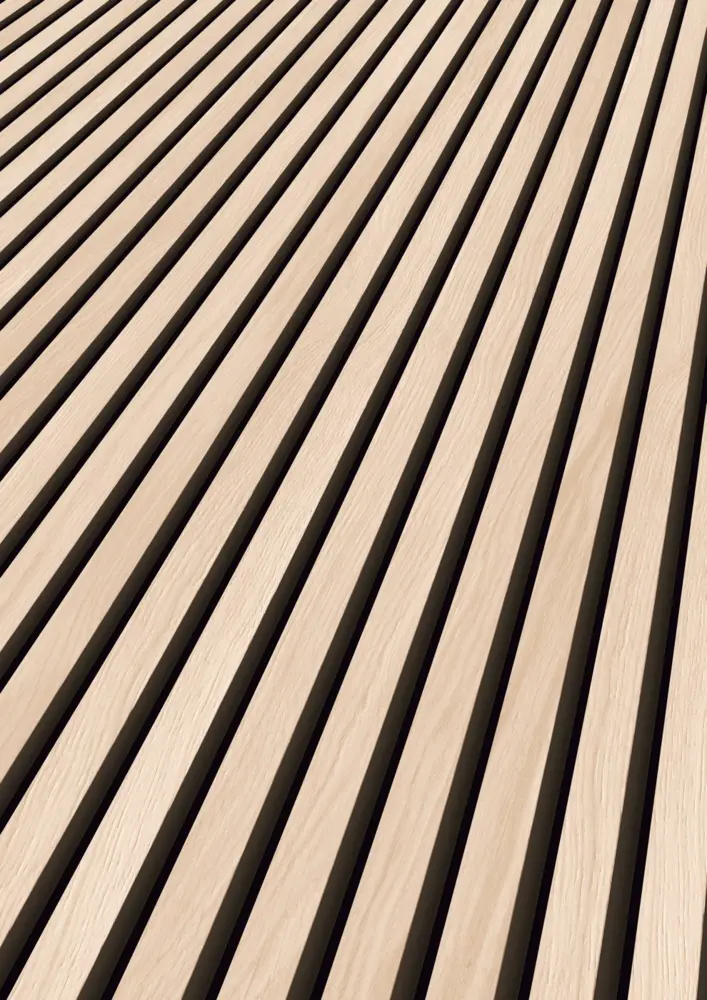 Die Akustikpaneele der 1-Side Collection von ter Hürne verbinden zeitloses Eiche-Design mit funktionaler Wand- und Deckengestaltung. Das Dekor Eiche Themse Fineline wirkt ruhig und modern, während die mattierte, leicht strukturierte Oberfläche für eine natürliche Anmutung sorgt. Durch die weiß geölte Veredelung kommt die charakteristische Eichenoptik besonders harmonisch zur Geltung.