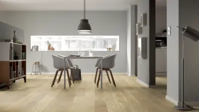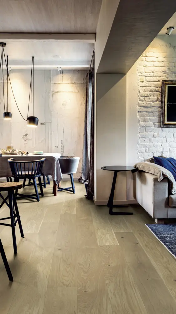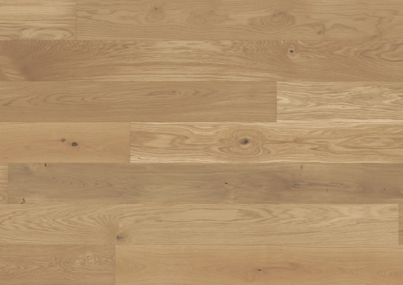 Entdecken Sie das Fertigparkett der Grand Velvet Collection von ter Hürne in der eleganten Ausführung Eiche lichtbeige. Die helle, natürliche Optik im Landhausdielenformat verleiht Ihrem Wohnraum ein modernes und freundliches Ambiente. Die gebürstete und mattlackierte Oberfläche sorgt für eine angenehme Haptik und hebt die ausdrucksstarke Eichenstruktur hervor.