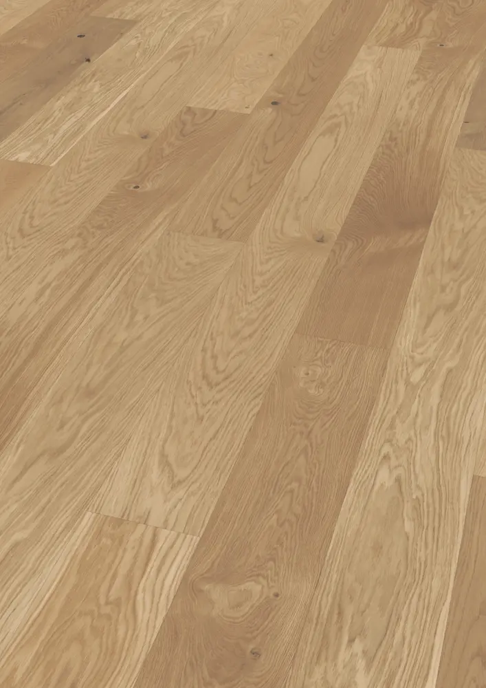 Das dreischichtige Aufbaukonzept mit einer robusten Nutzschicht aus Eiche bietet beste Voraussetzungen für dauerhaften Wohnkomfort. Dank des fortschrittlichen CLICKitEASY-Systems gelingt die Verlegung besonders einfach und sicher – wahlweise schwimmend oder vollflächig verklebt. Die Landhausdiele überzeugt durch ein großzügiges Format mit einer Länge von 2390 mm und einer Breite von 200 mm.