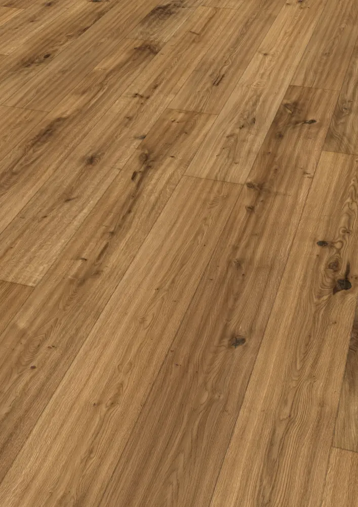 Das Fertig-Parkett überzeugt durch seinen mehrschichtigen Aufbau mit einer robusten 3,5 mm Deckschicht aus Echtholz und einer stabilen Mittellage aus Fichte. Die 2390 mm langen und 200 mm breiten Dielen bringen Großzügigkeit und Langlebigkeit in jeden Raum. Die umlaufenden Rundkanten verleihen dem Boden ein harmonisches Gesamtbild.