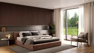 Die Oberfläche ist furniert und naturgeölt ausgeführt. Dadurch bleibt der authentische Holzcharakter erhalten, während die matte Optik für ein elegantes, zurückhaltendes Erscheinungsbild sorgt. Das Ergebnis ist eine zeitlose Wand- und Deckengestaltung mit wohnlicher Tiefe und harmonischem Farbspiel in Nussbaum.