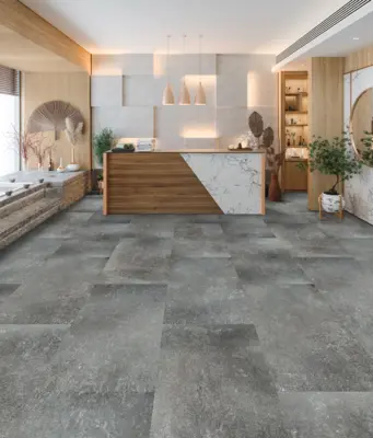 Der Designboden Ziro Naturalan Artstone Lismore verbindet authentische Steinoptik mit modernem Komfort. Das markante Fliesenformat und die lebhafte Oberfläche schaffen ein elegantes, zeitgemäßes Ambiente. Die graue Farbgebung ist vielseitig kombinierbar und bleibt langlebig attraktiv.